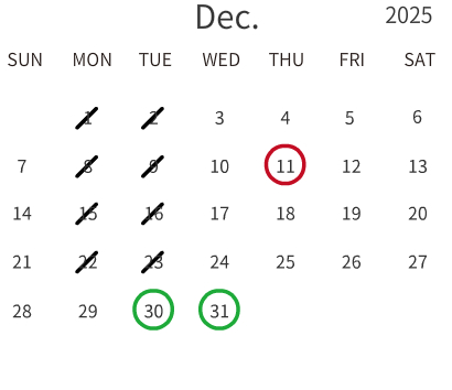 - =12/30(10:00-16:00),12/31(10:00-15:00)